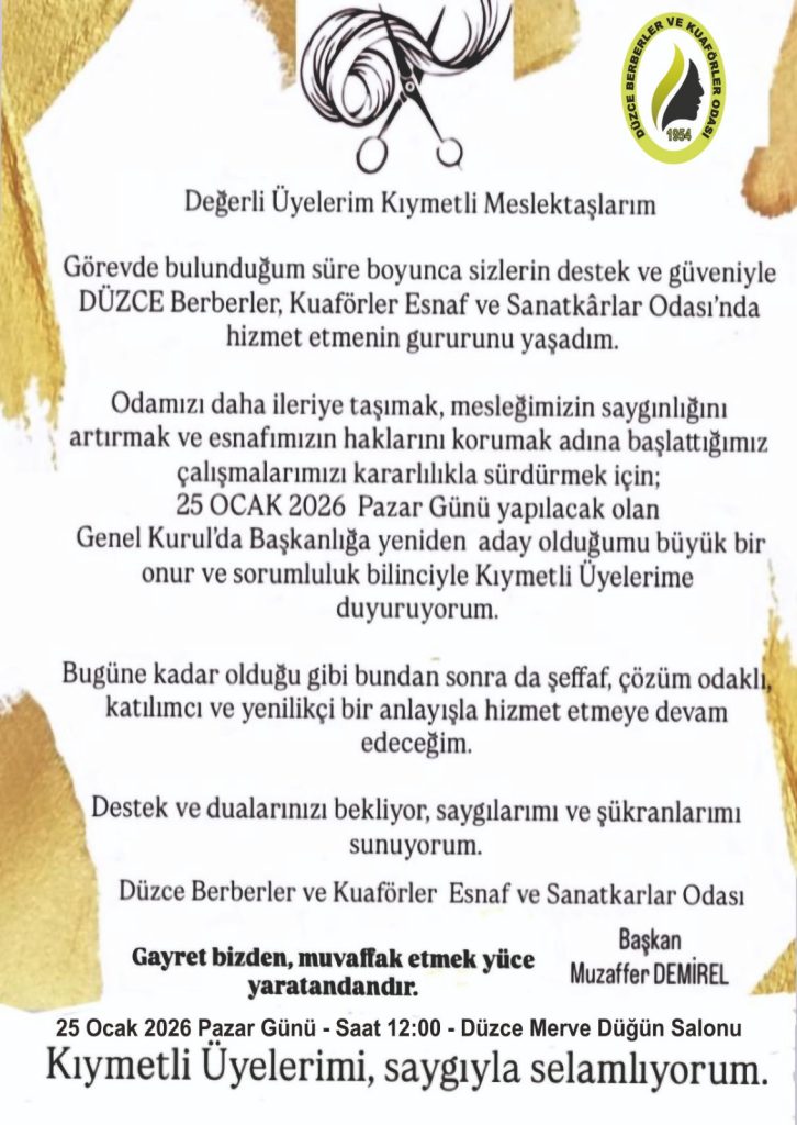 Düzce Berberler ve Kuaförler Esnaf ve Sanatkârlar Odası Başkanı Muzaffer Demirel, 25 Ocak 2026 Pazar günü gerçekleştirilecek genel kurul öncesinde yeniden aday olduğunu kamuoyuna duyurdu. Görev süresi boyunca üyelerinin desteği ve güveniyle hizmet etmenin gururunu yaşadığını belirten Demirel, yeni dönemde de aynı kararlılıkla çalışmaya devam edeceğini vurguladı.